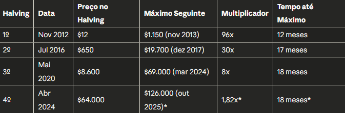 * Máximo atingido até outubro de 2025. O próximo halving só ocorrerá em 2028.